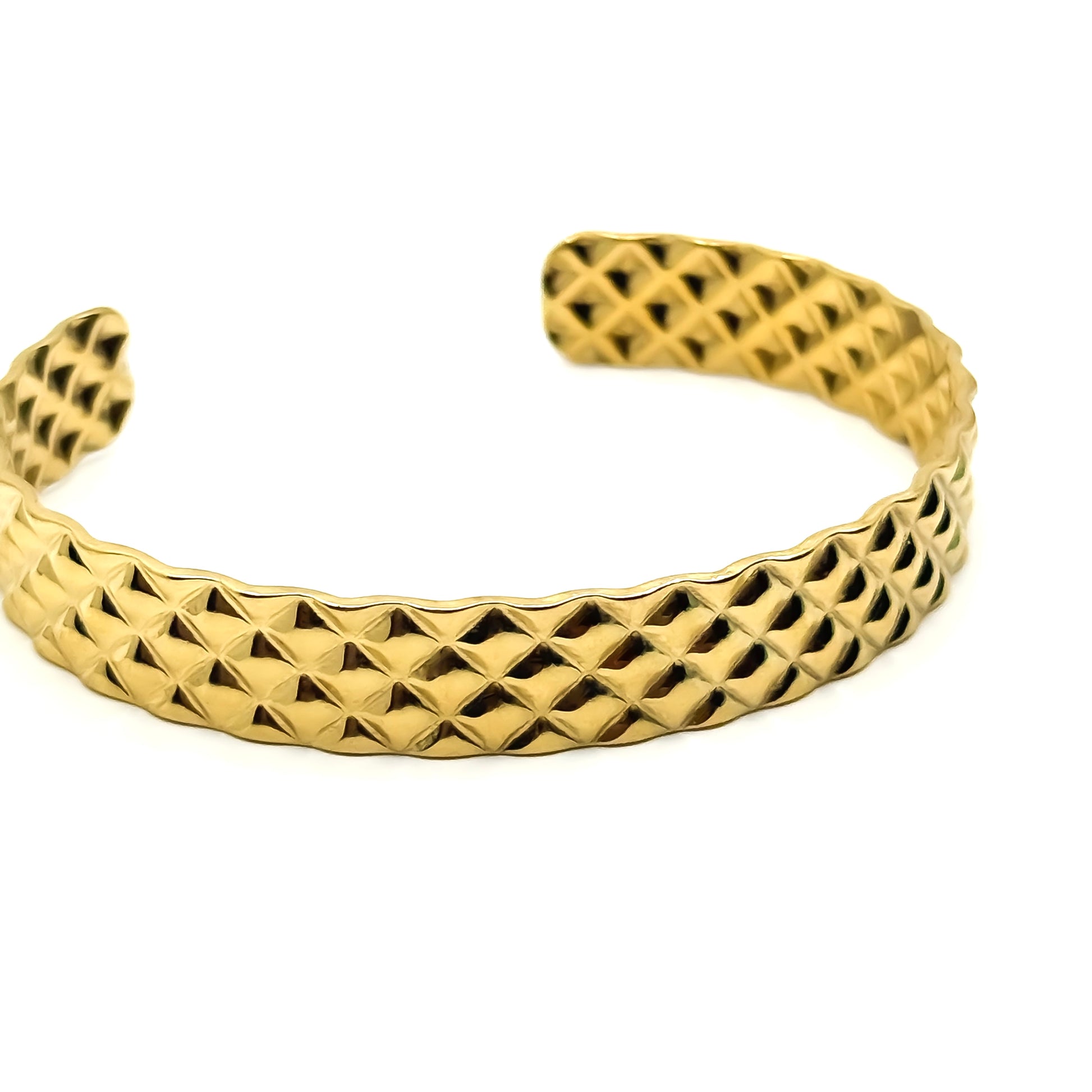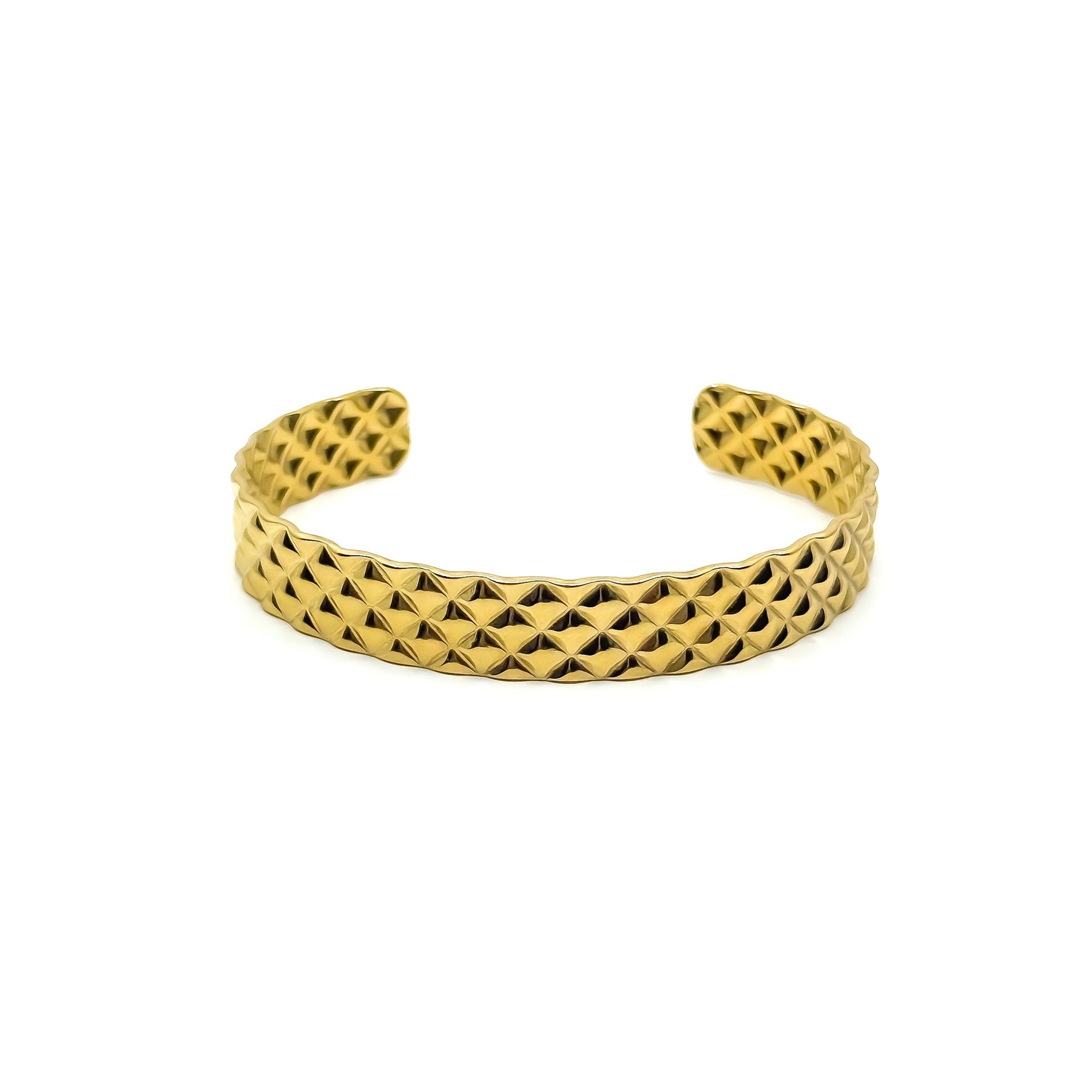 Stainless steel cuff bracelet in a gold-tone finish with a bold, geometric texture. The raised, diamond-patterned surface reflects light from multiple angles, giving the piece strong visual depth and character. A statement design that feels structured and confident, ideal for wearing solo or as a focal piece in a layered look.