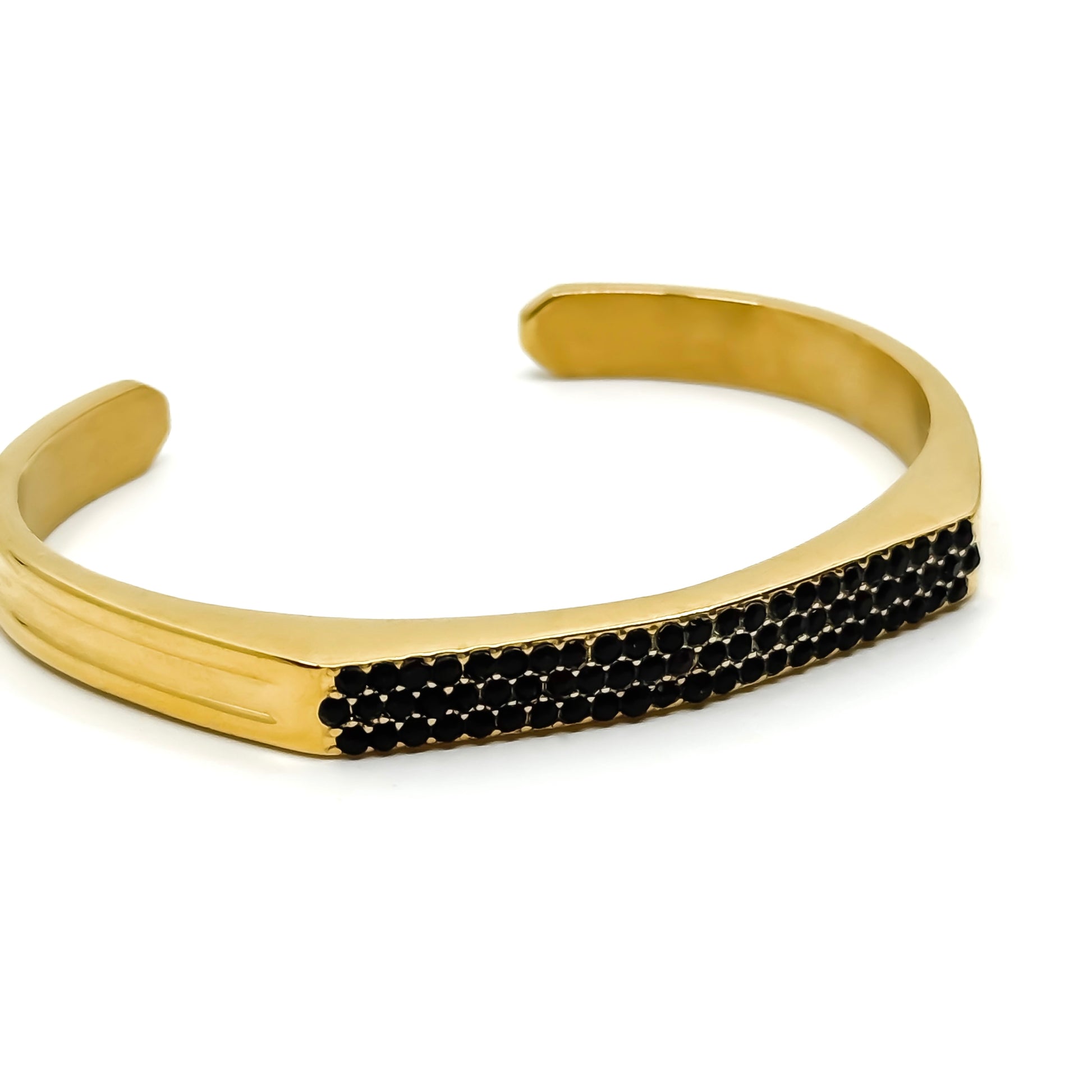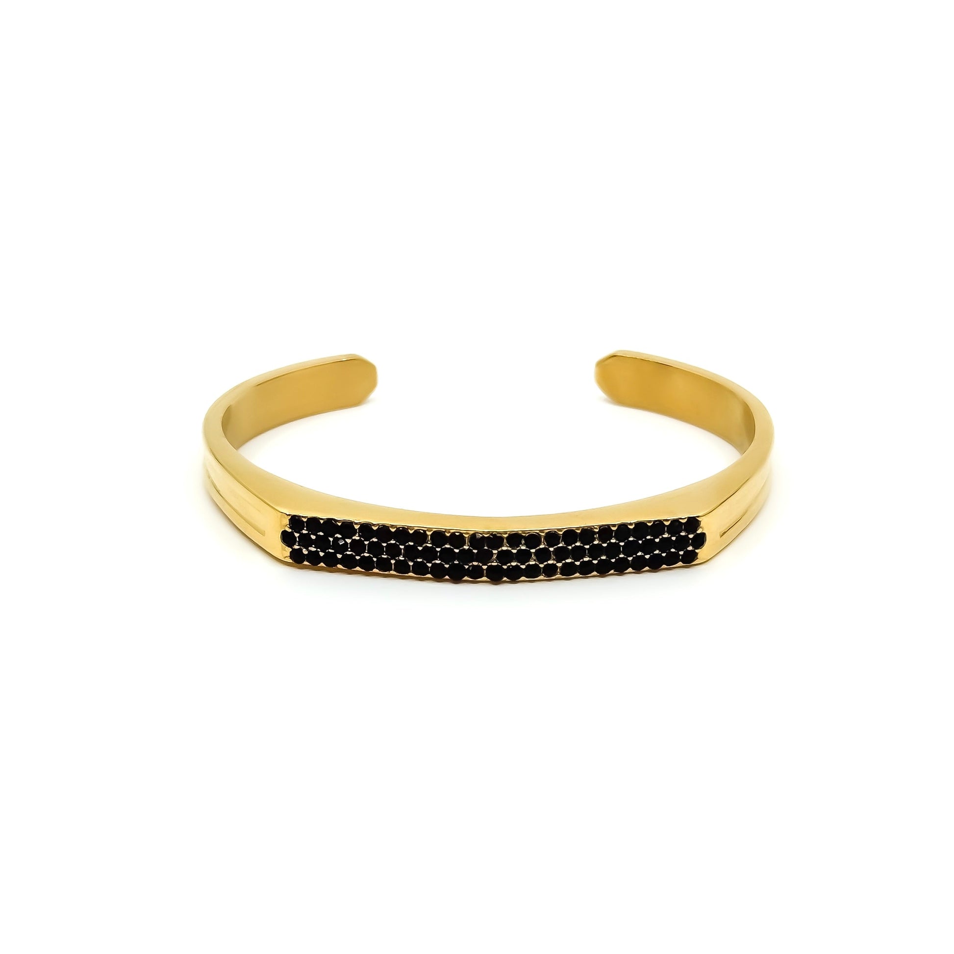 Stainless steel cuff bracelet in a gold-tone finish, accented with a row of black stones along the front. The smooth, clean lines contrast with the dark detailing, creating a sharp and confident look. A refined statement piece that works equally well on its own or layered with simpler bracelets.