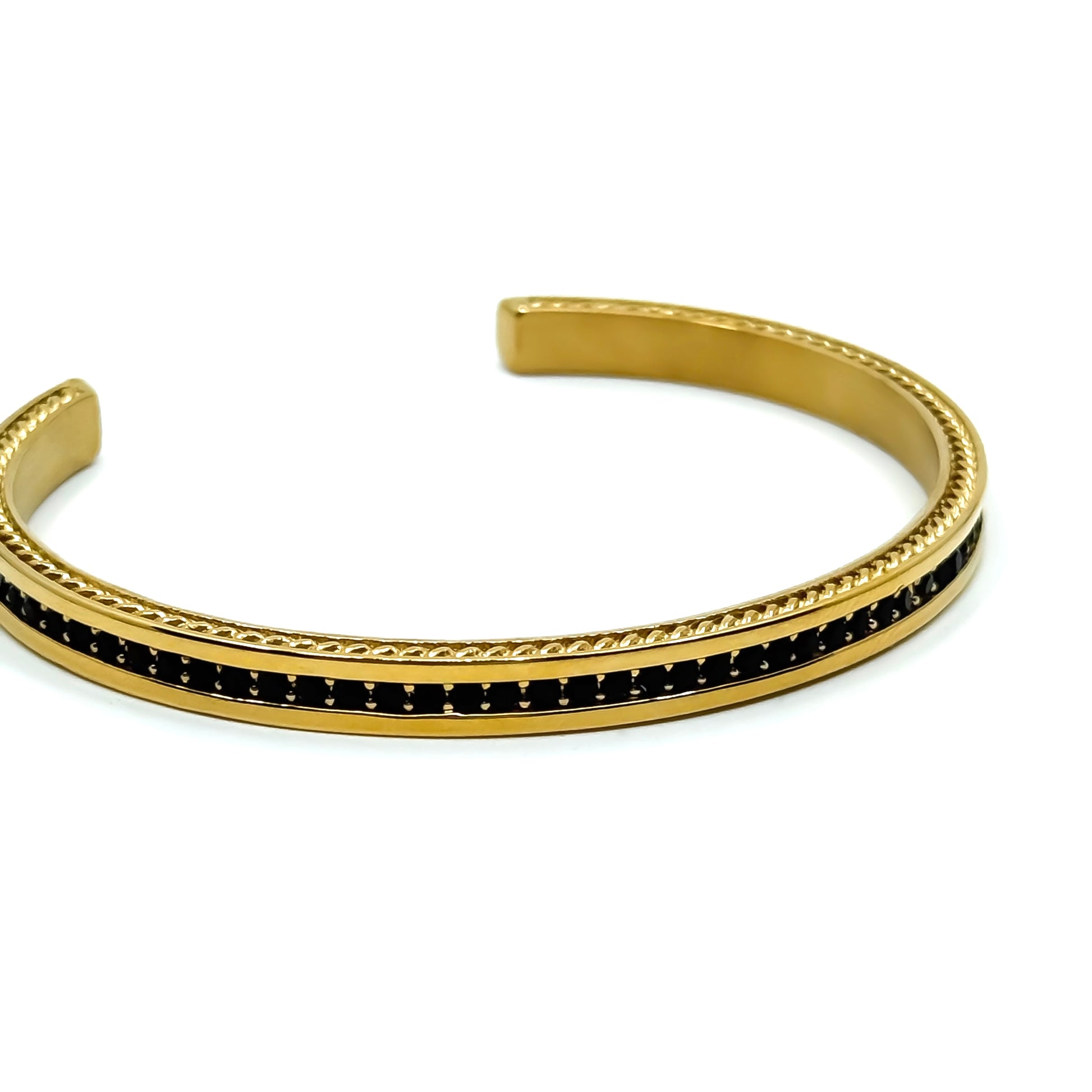 Stainless steel cuff bracelet with a gold-tone finish and a slim black inlay running through the center. Subtle textured edges frame the design, adding depth without overpowering the clean silhouette. An elegant, understated piece ideal for everyday wear or refined layering.