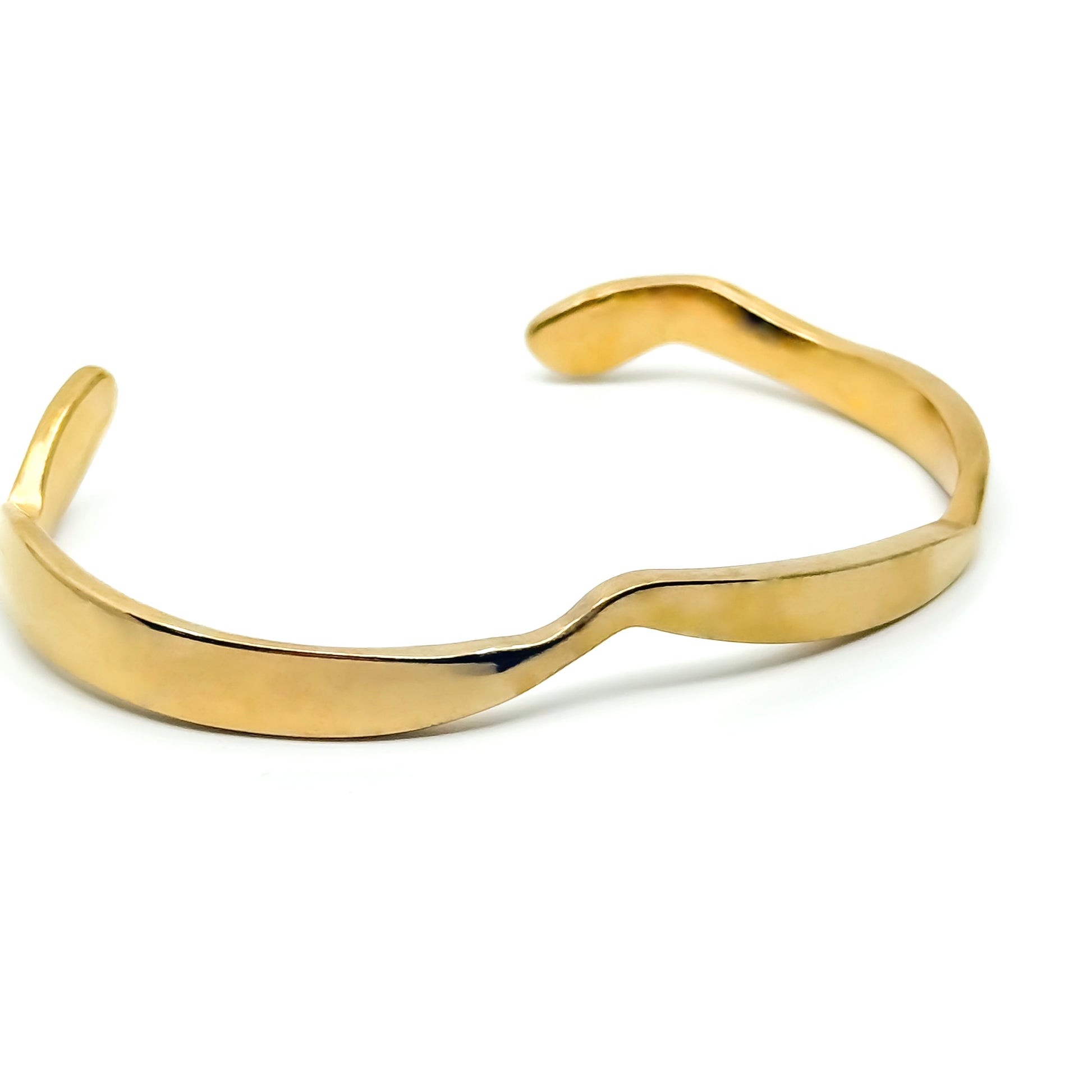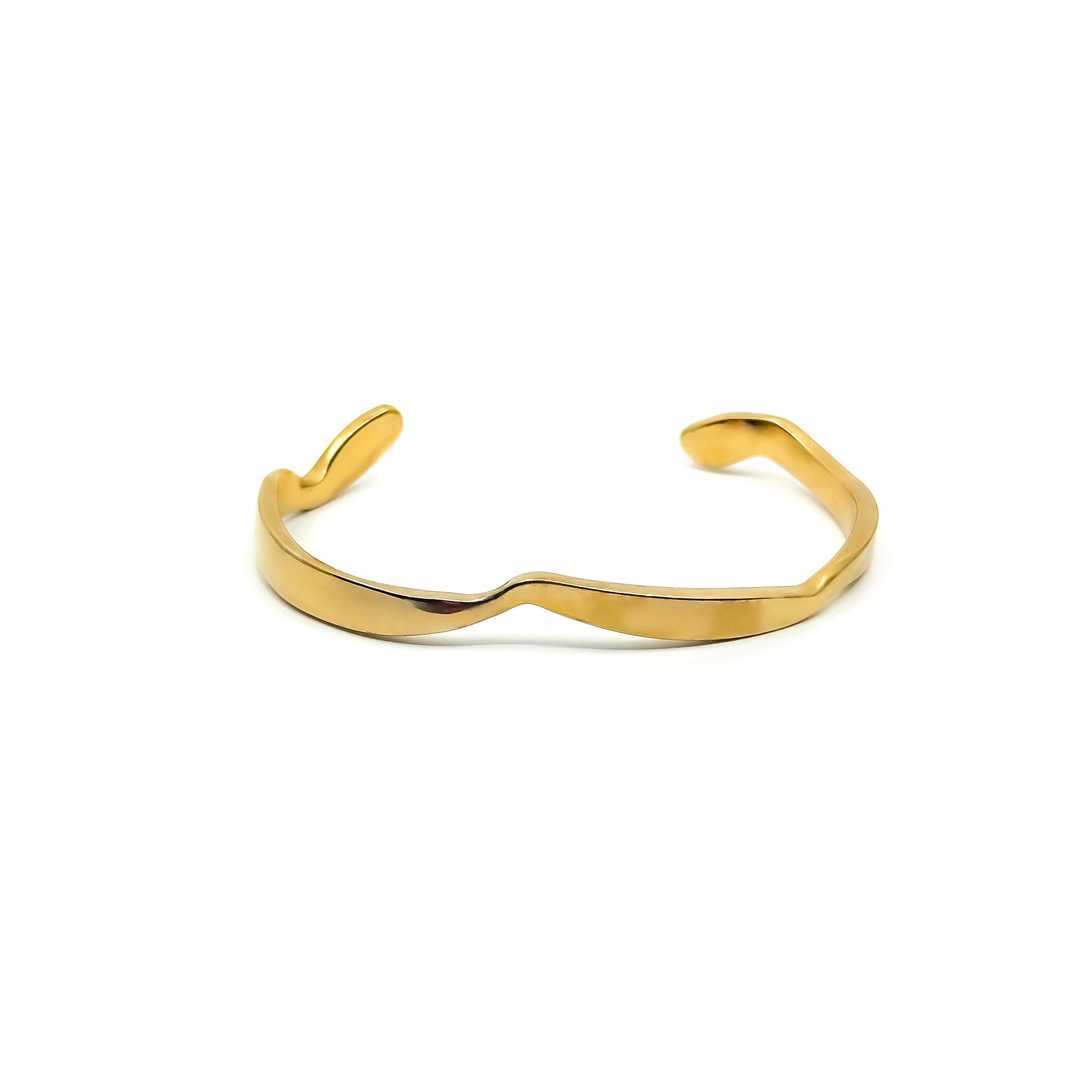 Stainless steel cuff bracelet with a gold-tone finish and a softly undulating shape. The smooth, flowing line creates a sense of movement, while the polished surface reflects light with subtle elegance. A refined design that stands out on its own or pairs effortlessly with other pieces.