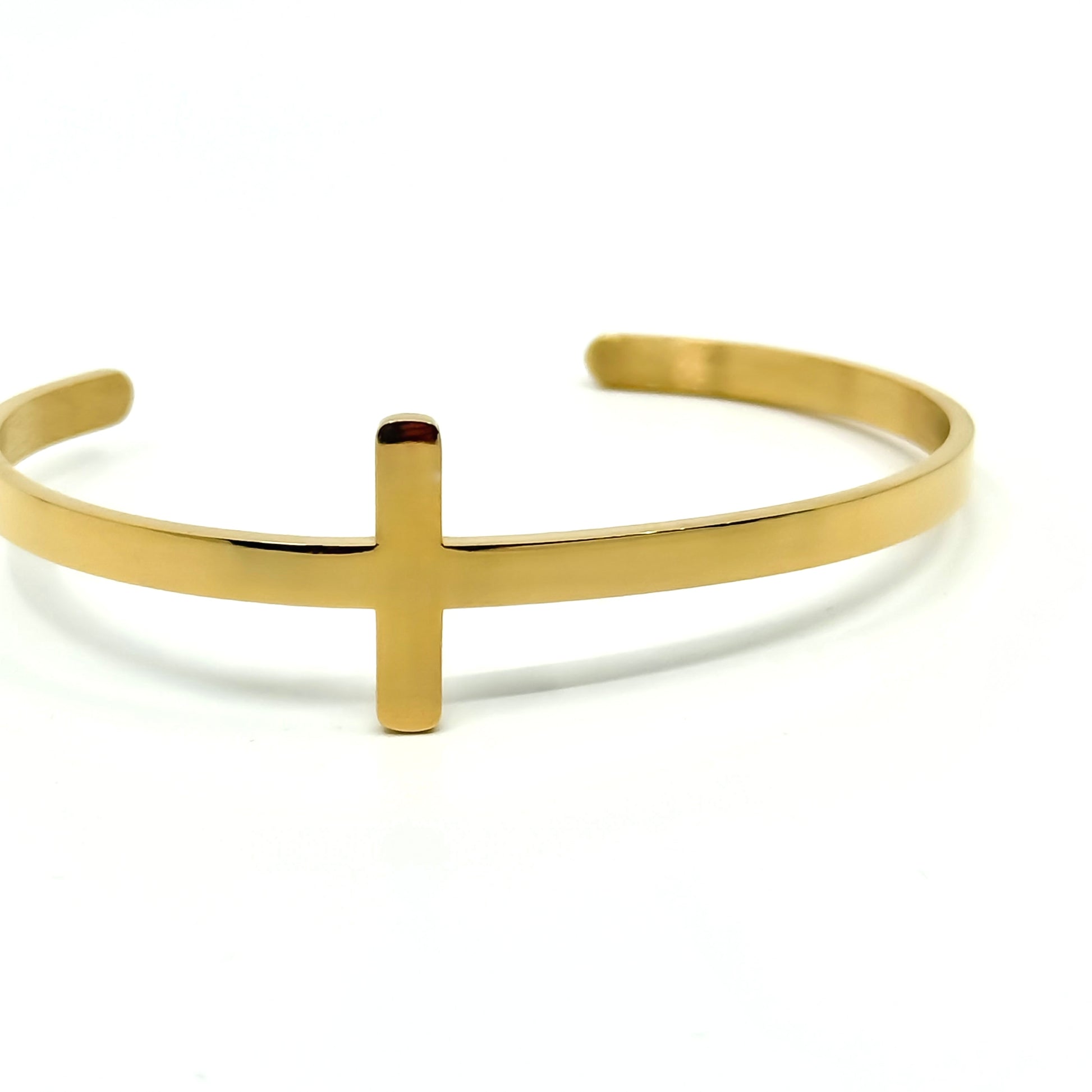 Stainless steel cuff bracelet with a gold-tone finish and a clean cross detail at the center. The smooth, minimal band highlights the geometric form, creating a bold yet balanced look. A modern statement piece that stands strong on its own or pairs easily with other bracelets.