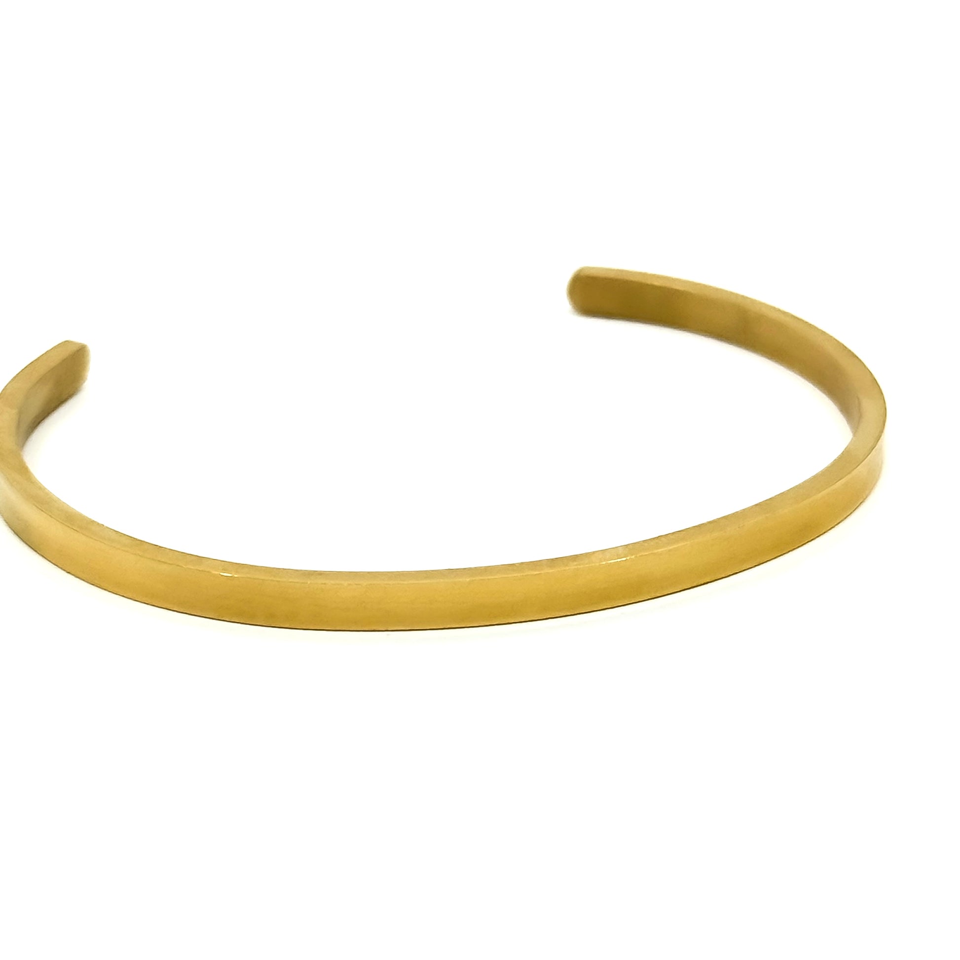 Stainless steel cuff bracelet with a smooth, uniform silhouette and a warm gold-tone finish. The clean, uninterrupted surface reflects light softly, giving it a refined and timeless character. A versatile piece designed for everyday wear, perfect on its own or layered with other bracelets.