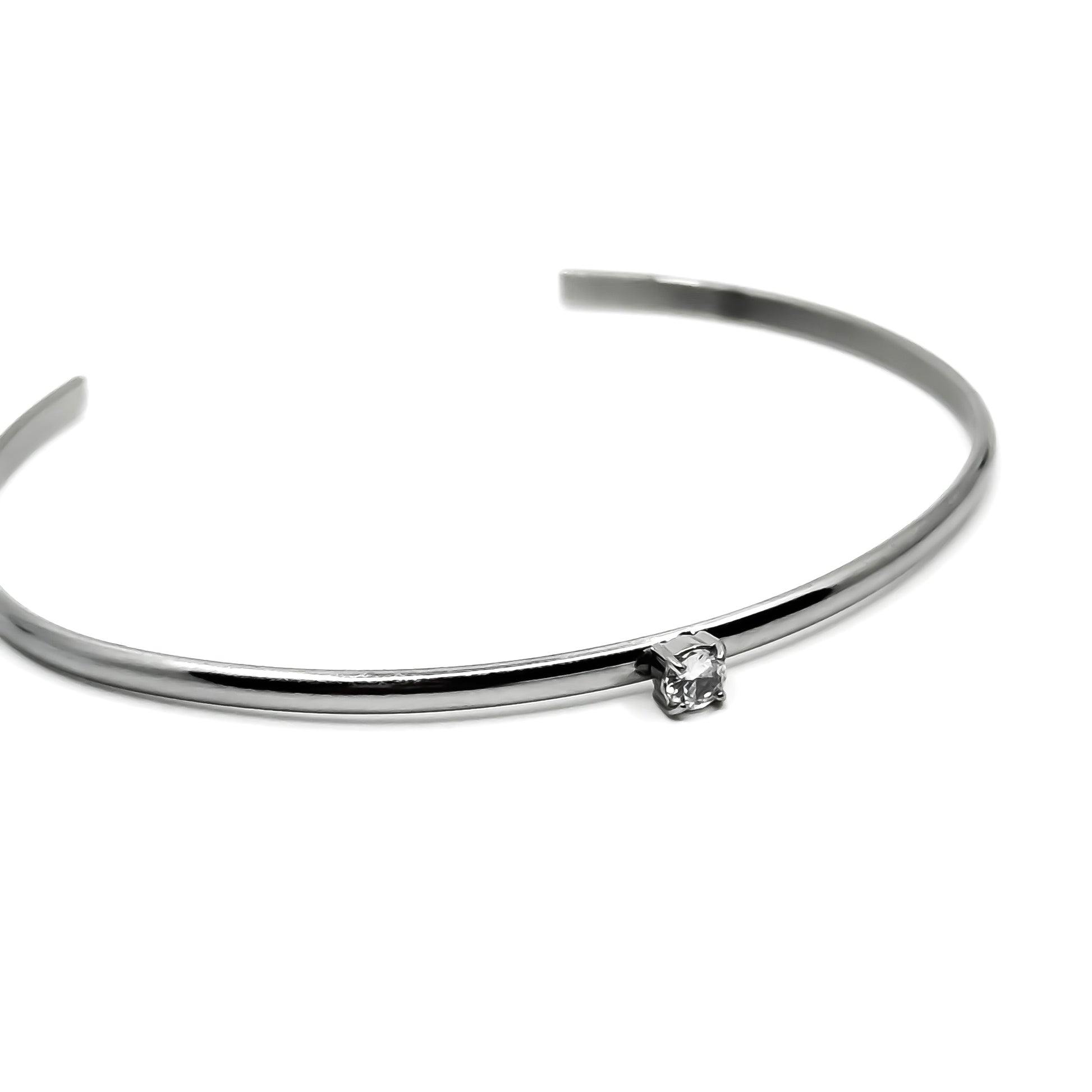 Minimal stainless steel cuff bracelet featuring a single clear stone accent set into a sleek polished band. Clean and refined, it balances subtle shine with a precise focal detail, creating a timeless piece designed for understated everyday wear or elegant layering.