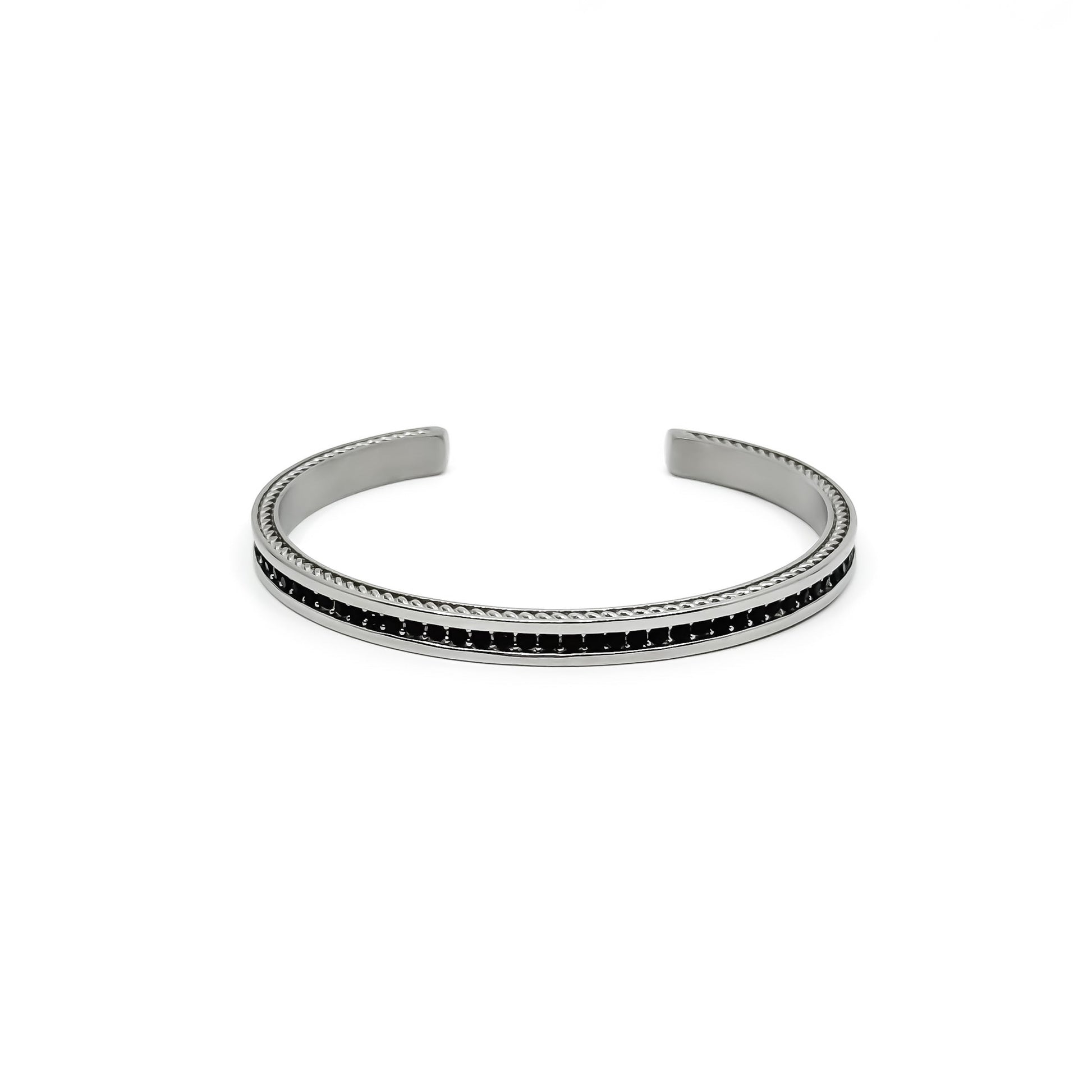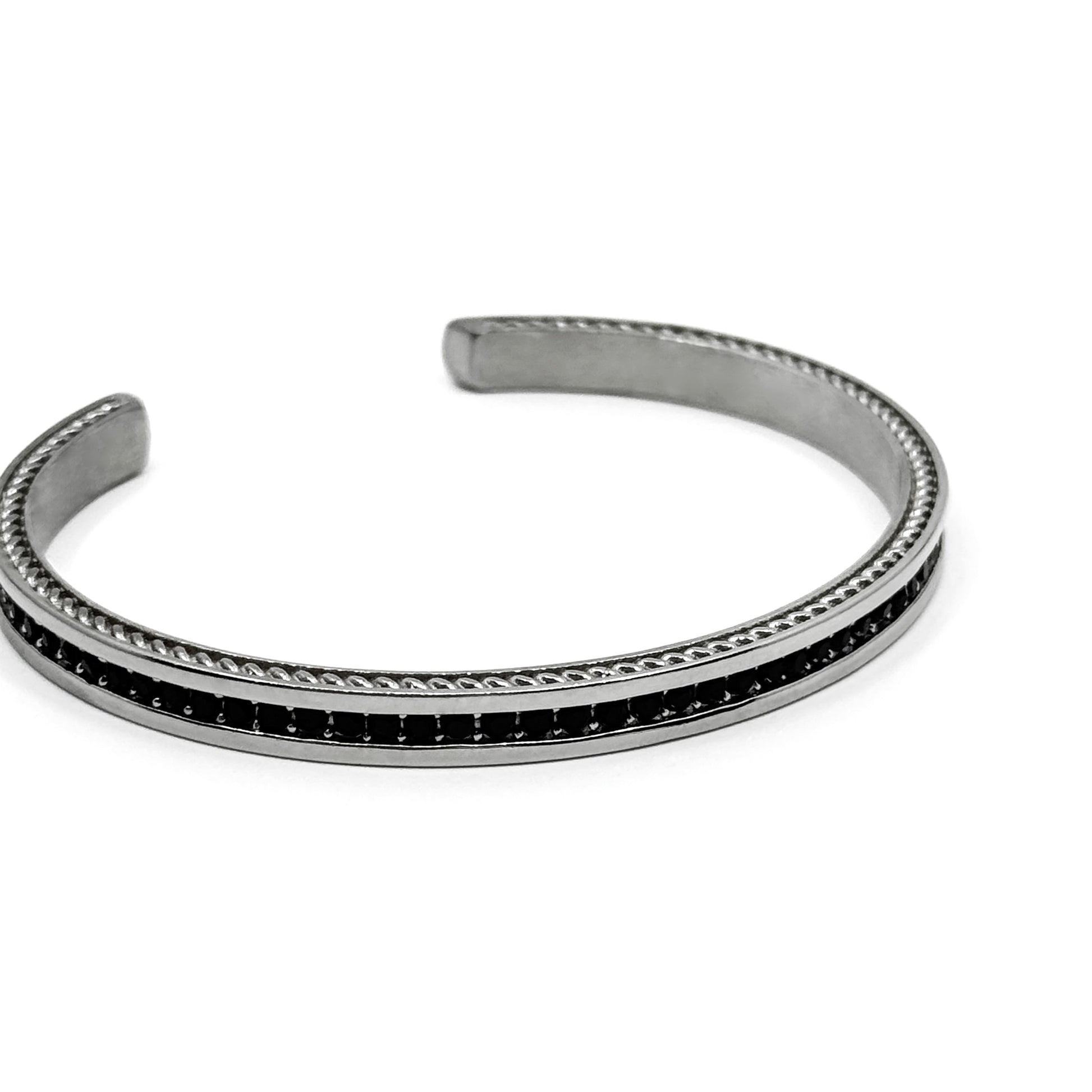 A refined stainless steel open cuff bracelet featuring a continuous row of black stones framed. The polished silver-tone finish contrasts with the dark inlay, while the ornamental pattern adds a subtle touch of heritage character. Balanced, bold, and designed for everyday wear.