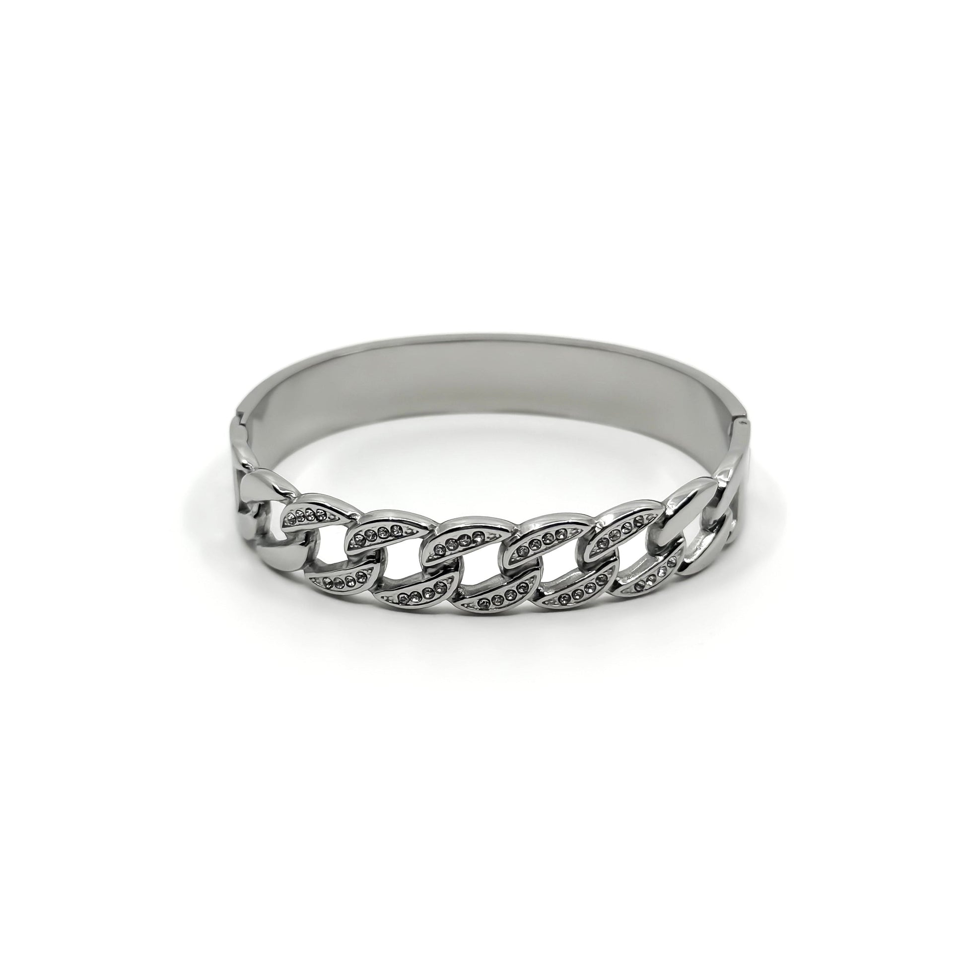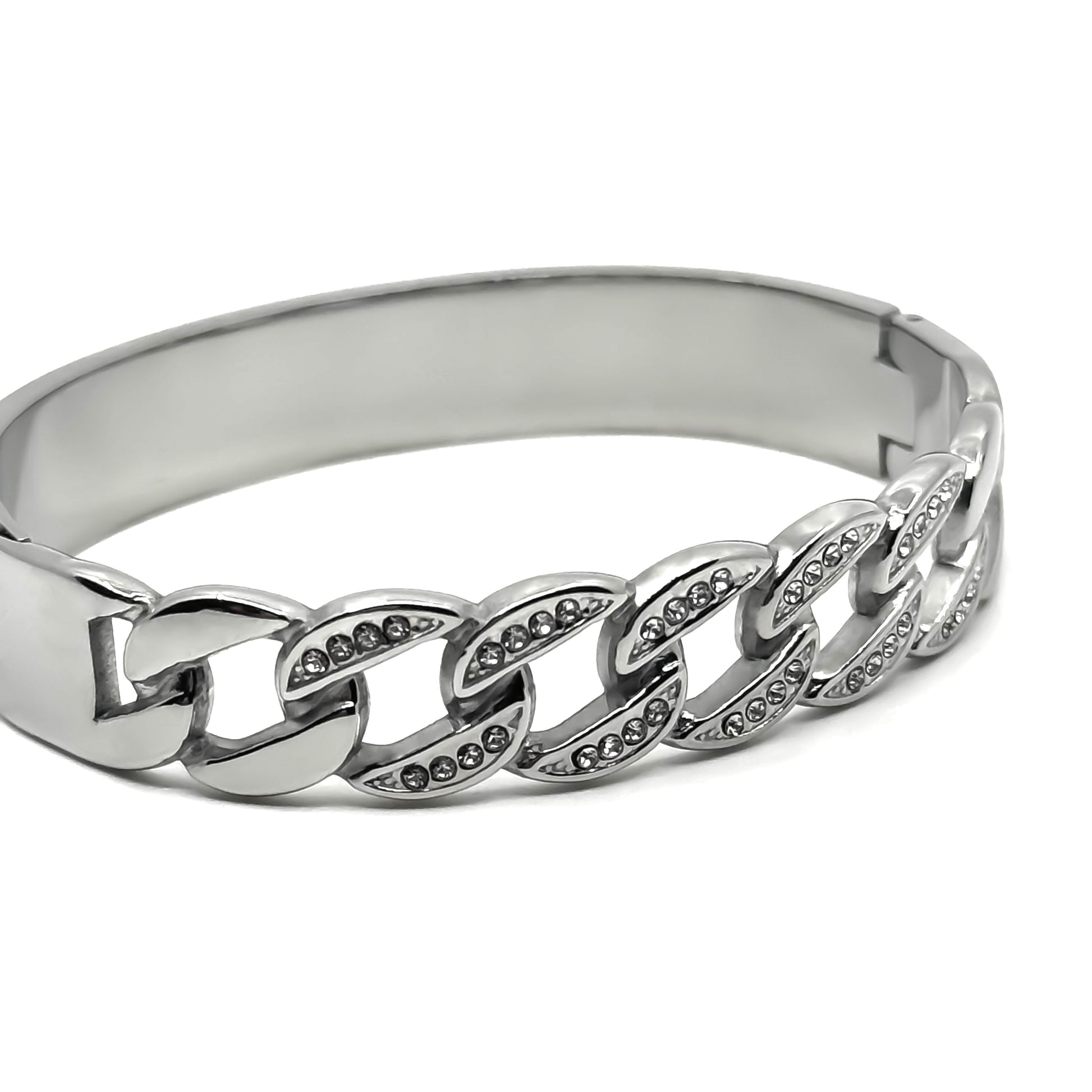 Stainless steel bangle bracelet featuring a bold chain-link motif across the front, accented with small clear stones set into each link. The polished finish enhances the sculpted curves, creating a striking balance between shine and texture. A confident, statement piece that adds edge and refinement to everyday looks.