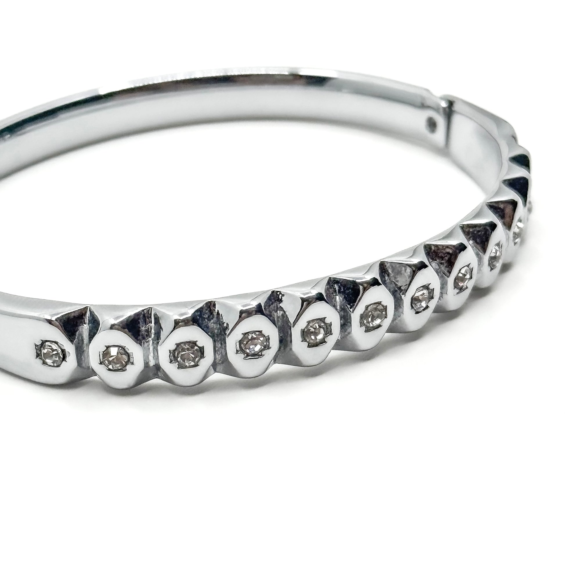 Stainless steel bangle bracelet with a sculpted geometric pattern, accented by small clear stones set along the front. The faceted design creates subtle light play and texture, while the polished finish keeps the look clean and refined. A balanced piece that combines sharp detailing with everyday elegance.