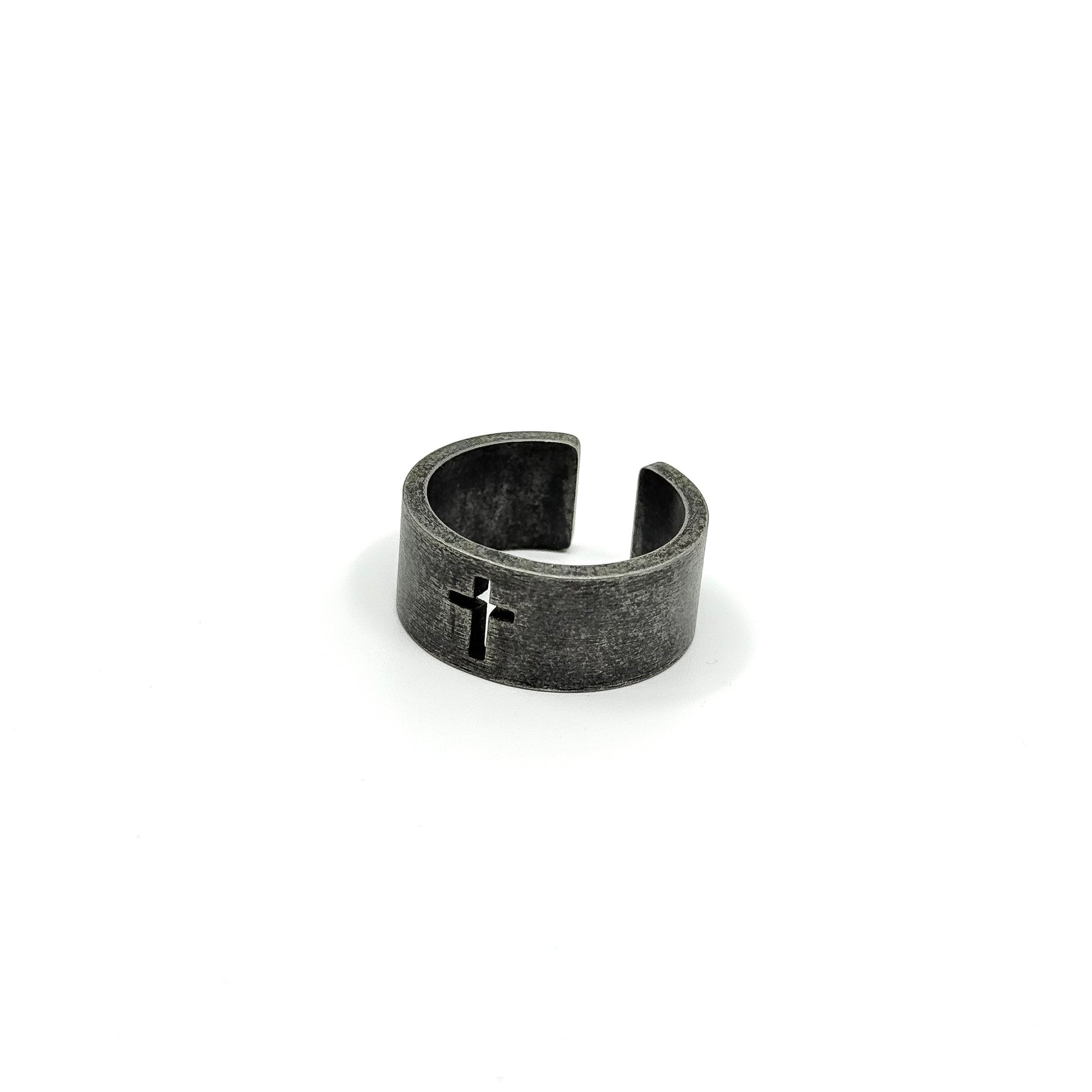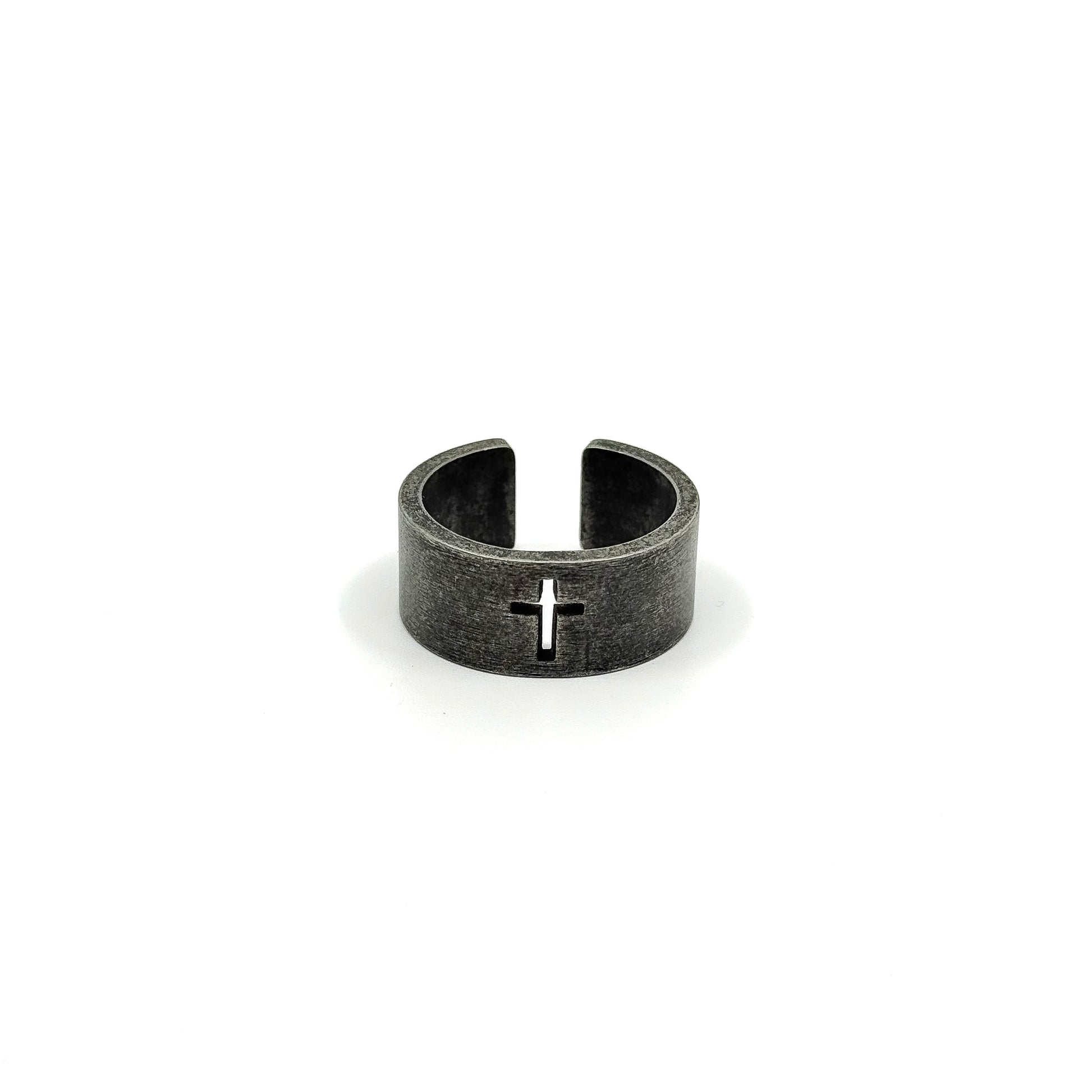 A minimalist ring crafted from stainless steel, featuring a matte, worn finish and a subtle cut-out cross detail. Adjustable and comfortable to wear, it delivers a raw, understated look with a strong symbolic edge, ideal for everyday styling on its own or paired with other rings.