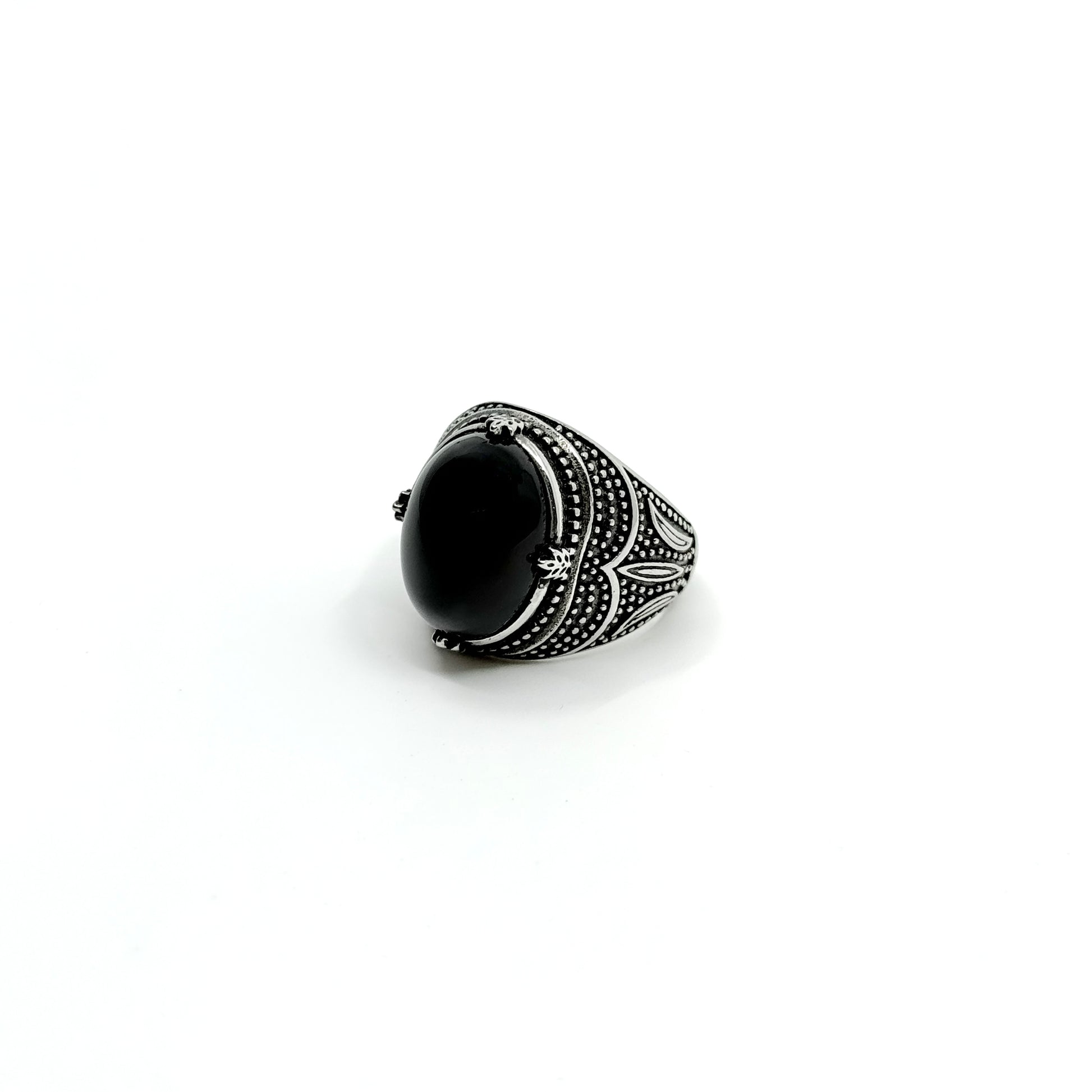 A stainless steel ring featuring a polished black oval stone set in a bold, textured band. Detailed with dotted accents and engraved lines, the design gives the ring a strong, timeless character. Durable and solid, made to stand out as a statement piece.
