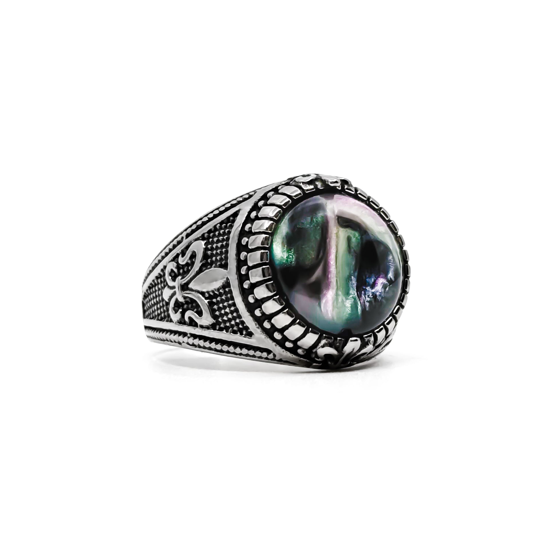 A solid stainless steel ring featuring a round iridescent stone with deep green, blue, and violet tones. The stone is framed by a detailed beaded bezel, while engraved fleur-de-lis motifs and textured oxidized accents run along the band. Bold yet refined, with rich contrast and a timeless character, designed for everyday wear.