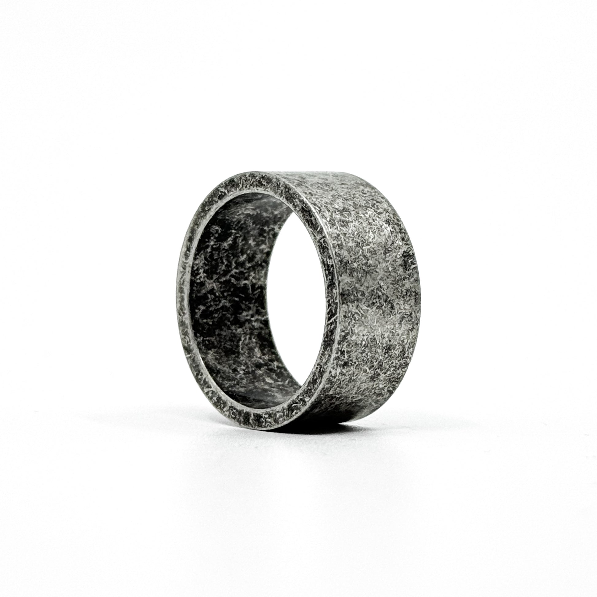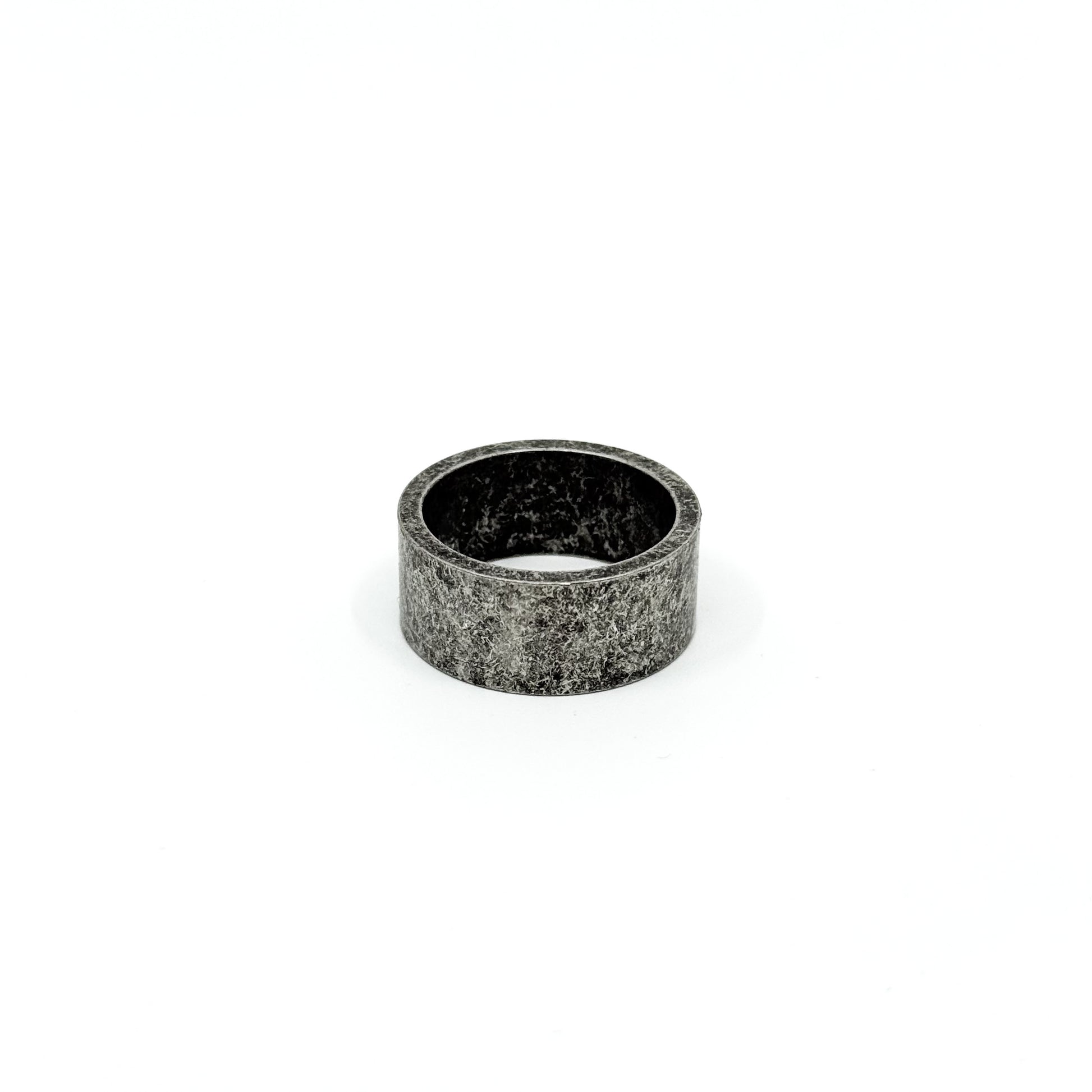 A solid wide band ring with a raw, stone-like textured finish. Crafted with a rugged, weathered surface that gives a natural, almost mineral character, this piece embraces an industrial aesthetic with understated strength. Minimal yet bold, designed for everyday wear with a timeless, masculine edge.